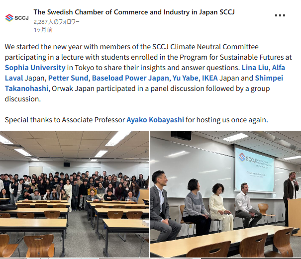 Prof. Ayako Kobayashi of the Department of Global Studies held a special session for SPSF students with the Climate Neutral Committee of the Swedish Chamber of Commerce and Industry in Japan (SCCJ) on January 13, 2026. We would like to express our sincere gratitude to the committee members, including representatives from Alfa Laval Japan, Baseload Power Japan, IKEA Japan, and Orwak Japan, for their valuable contributions. Students gained valuable insights through the panel discussion and the exchange of ideas.